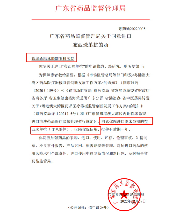 2月9日,依托“港澳药械通”政策,经广东省药品监督管理局审核,用于治疗年龄相关性黄斑变性(AMD)的诺华新药BEOVU®(brolucizumab布西珠单抗)获批在珠海希玛眼科医院使用。