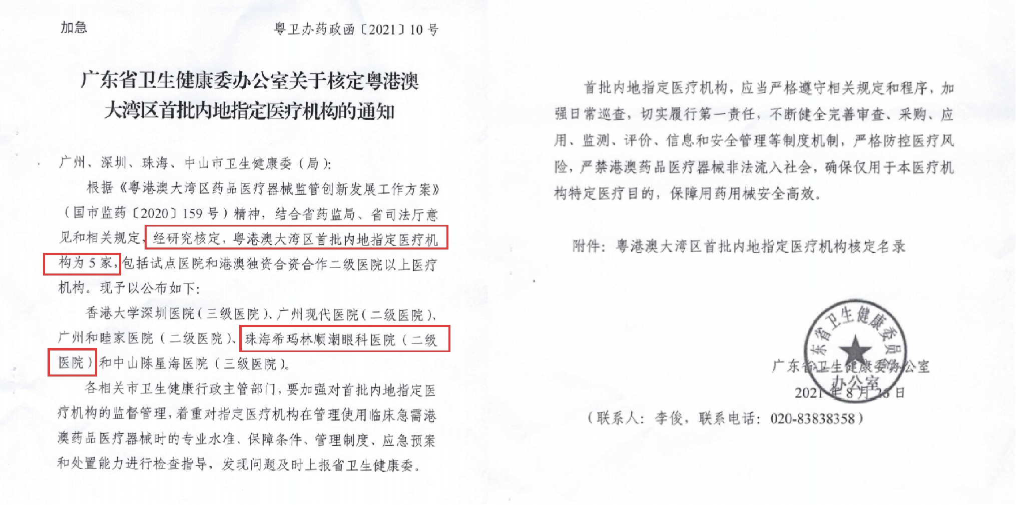 2021年8月27日,广东省药品监管局联合广东省卫健委召开新闻发布会宣布,通报“港澳药械通”试点工作情况。试点医院从香港大学深圳医院扩增至位于广州、深圳、珠海、中山的5家内地指定医疗机构。珠海希玛眼科医院成为5家首批内地、珠海市唯一的“港澳药械通”医疗机构。珠海希玛眼科医院可以引进眼科临床急需、已在港澳上市的药品和医疗器械。2022年2月9日,依托“港澳药械通”政策,用于治疗年龄相关性黄斑变性的国际眼科创新药诺华“布西珠单抗Beovu®”获批在珠海希玛眼科医院使用。