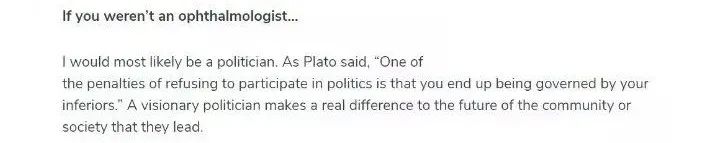 主办方采访林顺潮教授,“如果你不是眼科医生,会从事什么职业?”林顺潮教授回答道,我可能会成为政治家,因为有识之士可以通过自身努力,推动社会的发展与进步。