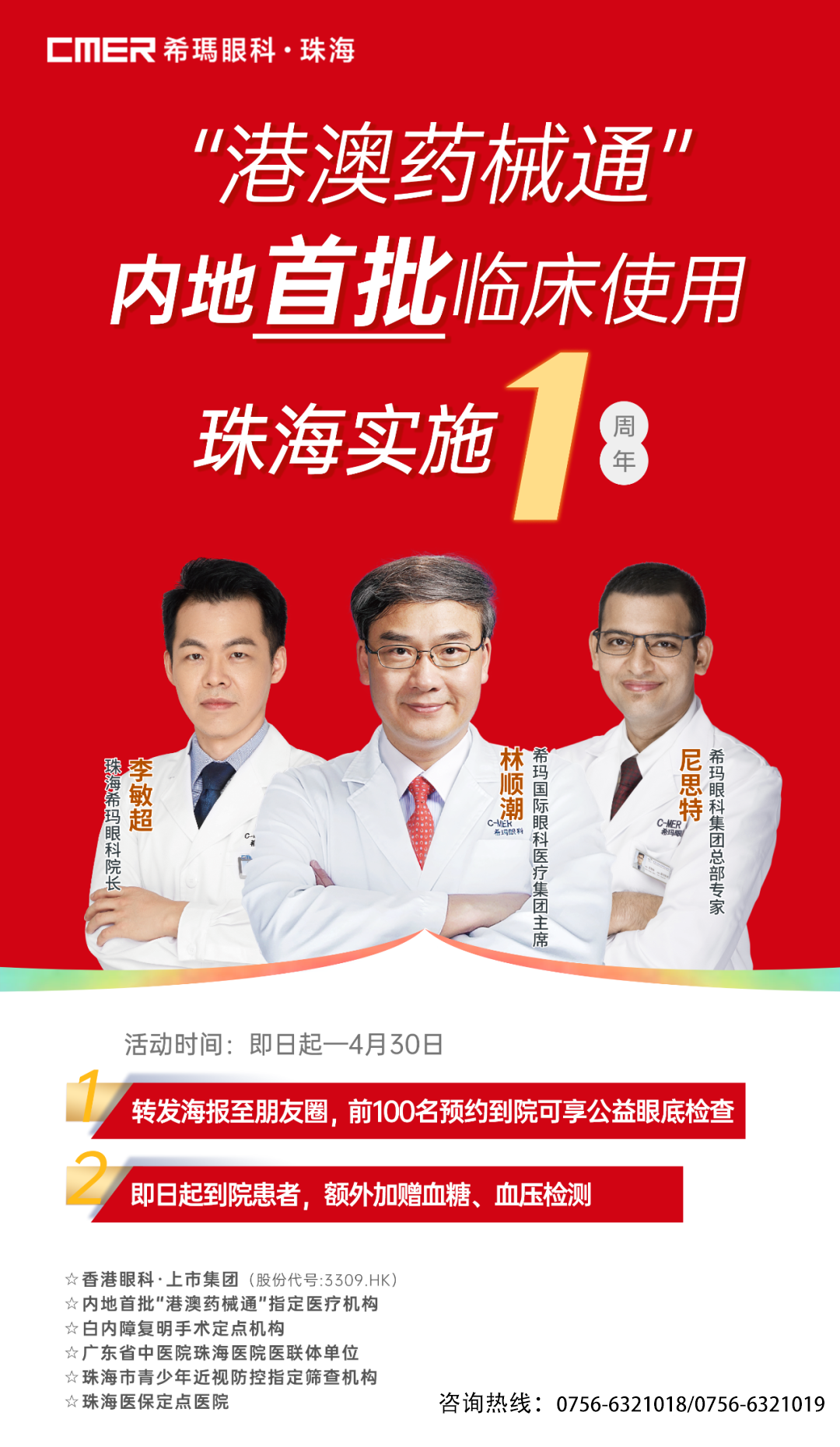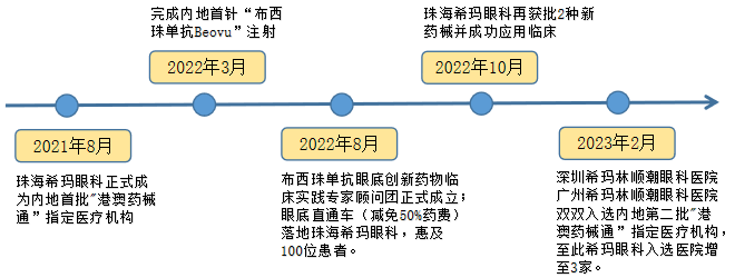 希玛眼科集团在积极响应国家医改的政策下,已进入内地十余年,希望能通过先行先试,把香港优质医疗服务辐射至内地,促进香港和内地医疗融合,共同提升整体医疗水平。乘着“港澳药械通”的东风,2021年8月,珠海希玛眼科正式成为内地首批“港澳药械通”指定医疗机构;2022年3月,珠海希玛引进眼底创新药“布西珠单抗Beovu”并完成内地首针注射;同年8月,布西珠单抗眼底创新药物临床实践专家顾问团正式成立;眼底直通车(减免50%药费)落地珠海希玛眼科,惠及100位老年性湿性黄斑变性患者;珠海希玛眼科再获批2种新药械并在10月成功应用临床。